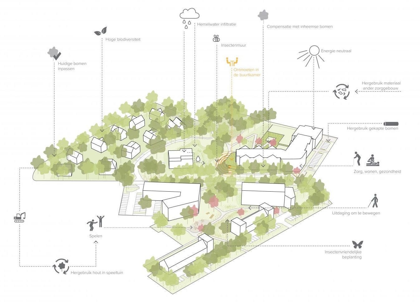 De locatie bevind zich vlak tegen het centrum van Ermelo, gelegen in een lommerrijke omgeving. Door de herontwikkeling ontstaan er kansen een uniek stuk dorp te maken waar een grote diversiteit aan mensen komen te wonen. Het ruimtelijke concept gaat uit van een centraal park dat de verschillende deelgebieden en programma met elkaar verbind. De lommerrijke kwaliteit blijft behouden en wordt als huidige kwaliteit gekoesterd. Bestaande bomen worden ingepast en zowel bebouwing als de paden voegen zich hiernaar.