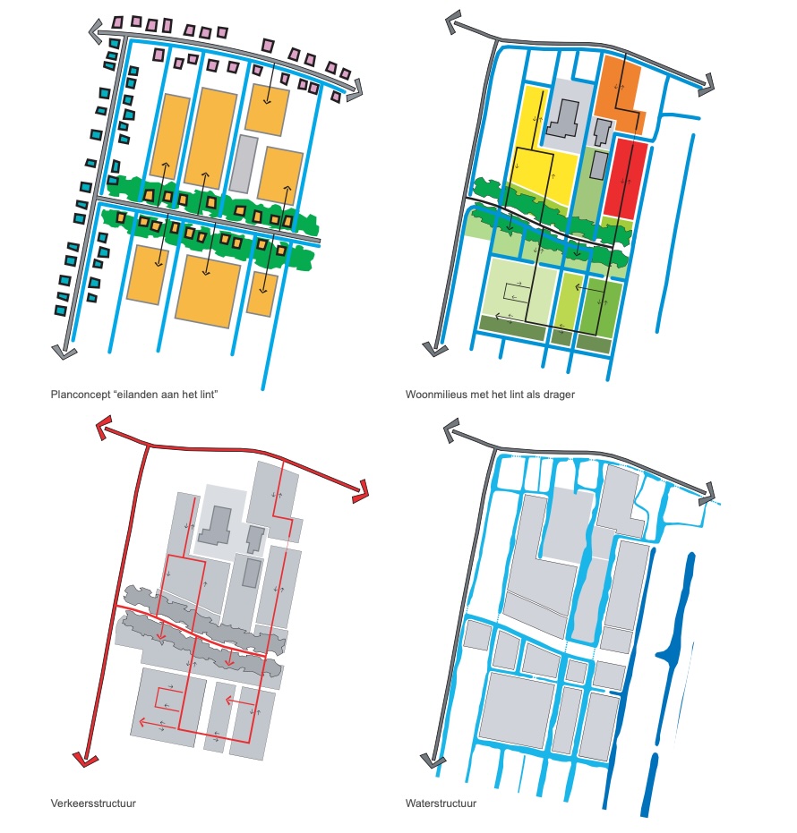 De gekozen stedenbouwkundige hoofdstructuur bestaat uit een nieuw bebouwingslint dat als ruggengraat door het plan slingert. Aan dit lint zijn verschillende woonbuurten gekoppeld, elk met een eigen identiteit. Deze ‘eilandenstructuur’ refereert aan de historische verkaveling van het veenlandschap en zorgt tegelijkertijd voor een heldere organisatie van de ruimte. In het ontwerp is volop aandacht voor de landschappelijke overgangen, met zichtlijnen richting het open polderlandschap, robuuste groenstructuren en behoud van bestaande sloten.