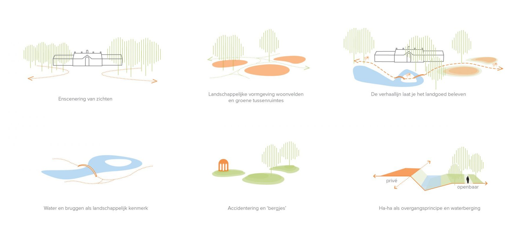 Binnen het ruimtelijk kader dienen elementen uit de periode van de landschapsstijl als inspiratie. De ontwikkelvlekken maken gebruik van de volgende ontwerpprincipes: