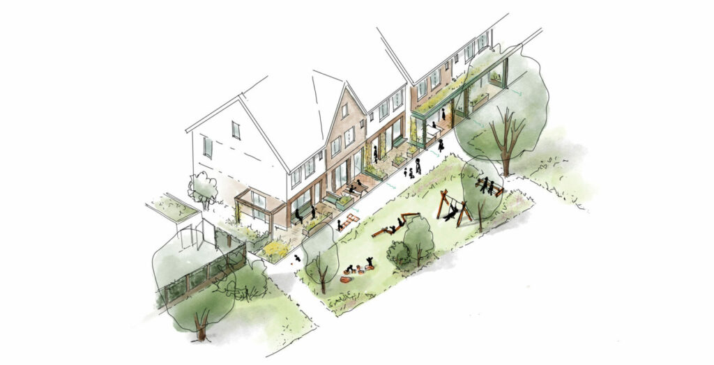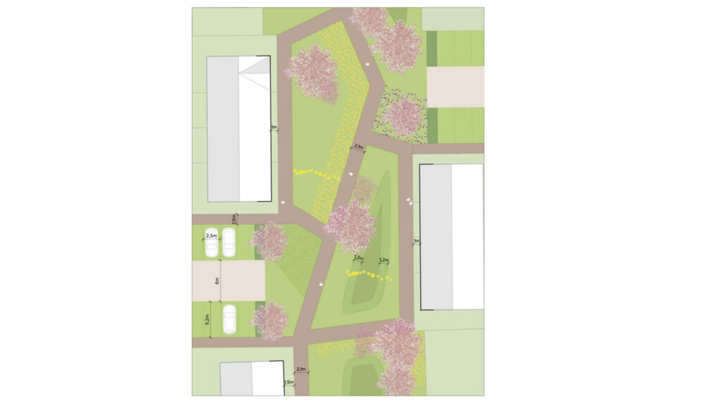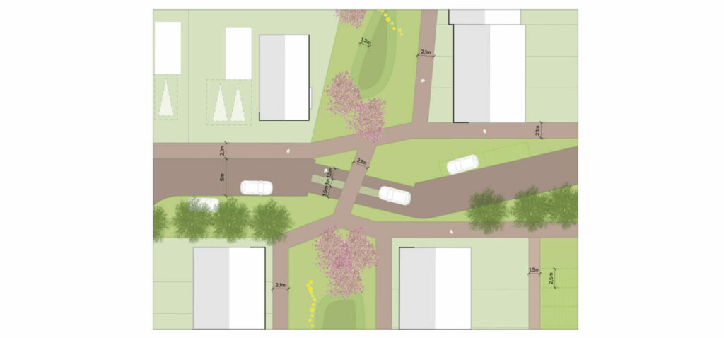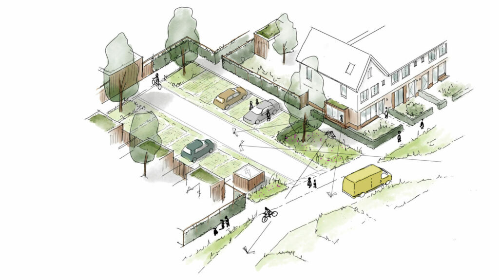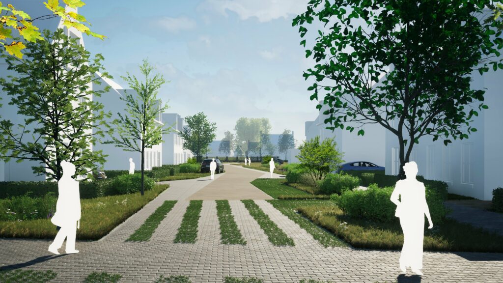 Mobiliteit is zo georganiseerd dat voetgangers en fietsers prioriteit krijgen. Straten zijn informeel en gelijkvloers ingericht, waarbij auto’s en langzaam verkeer gelijkwaardig zijn. Parkeren gebeurt grotendeels uit het zicht, in parkeerkoffers tussen de woningen of achter de bebouwing. Door deze keuzes blijft de openbare ruimte groen, rustig en uitnodigend.