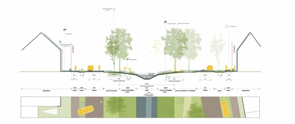 Klimaatbestendigheid is een dragend thema in het ontwerp. Waterberging is verwerkt in de groen/blauw structuur en in de wadi’s langs de dorpse route. Verharding is waar mogelijk beperkt en uitgevoerd in doorlatend materiaal. De inrichting van de openbare ruimte draagt bij aan het tegengaan van hittestress door het gebruik van schaduwgevende bomen en gelaagde beplanting.