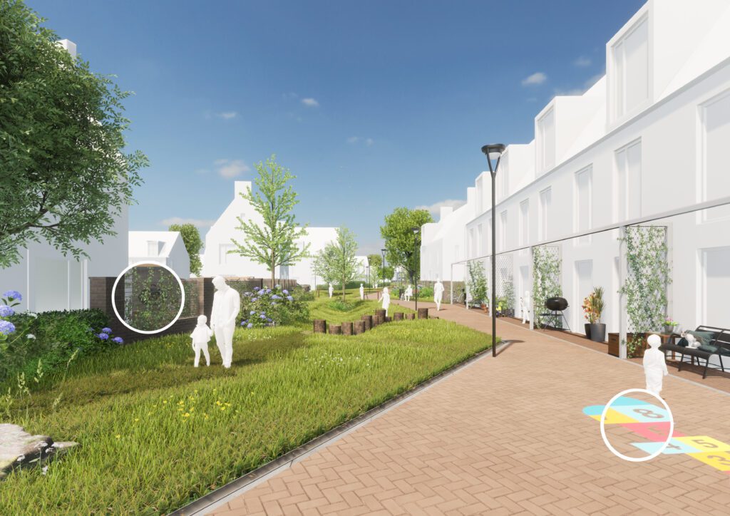 De inrichting van de openbare ruimte nodigt uit tot bewegen, spelen en ontmoeten. In elke straat is ruimte voor groen, en in de architectuur komen dorpse elementen terug zoals zadeldaken, variërende rooilijnen en kleinschalige bouwmassa’s. Dit alles creëert een prettige woonomgeving die aansluit bij de maat en schaal van Winssen, zonder in te boeten aan eigentijdse woonkwaliteit. Het is een wijk die is ontworpen voor mensen, waarin elke bewoner zich kan herkennen en thuisvoelen.