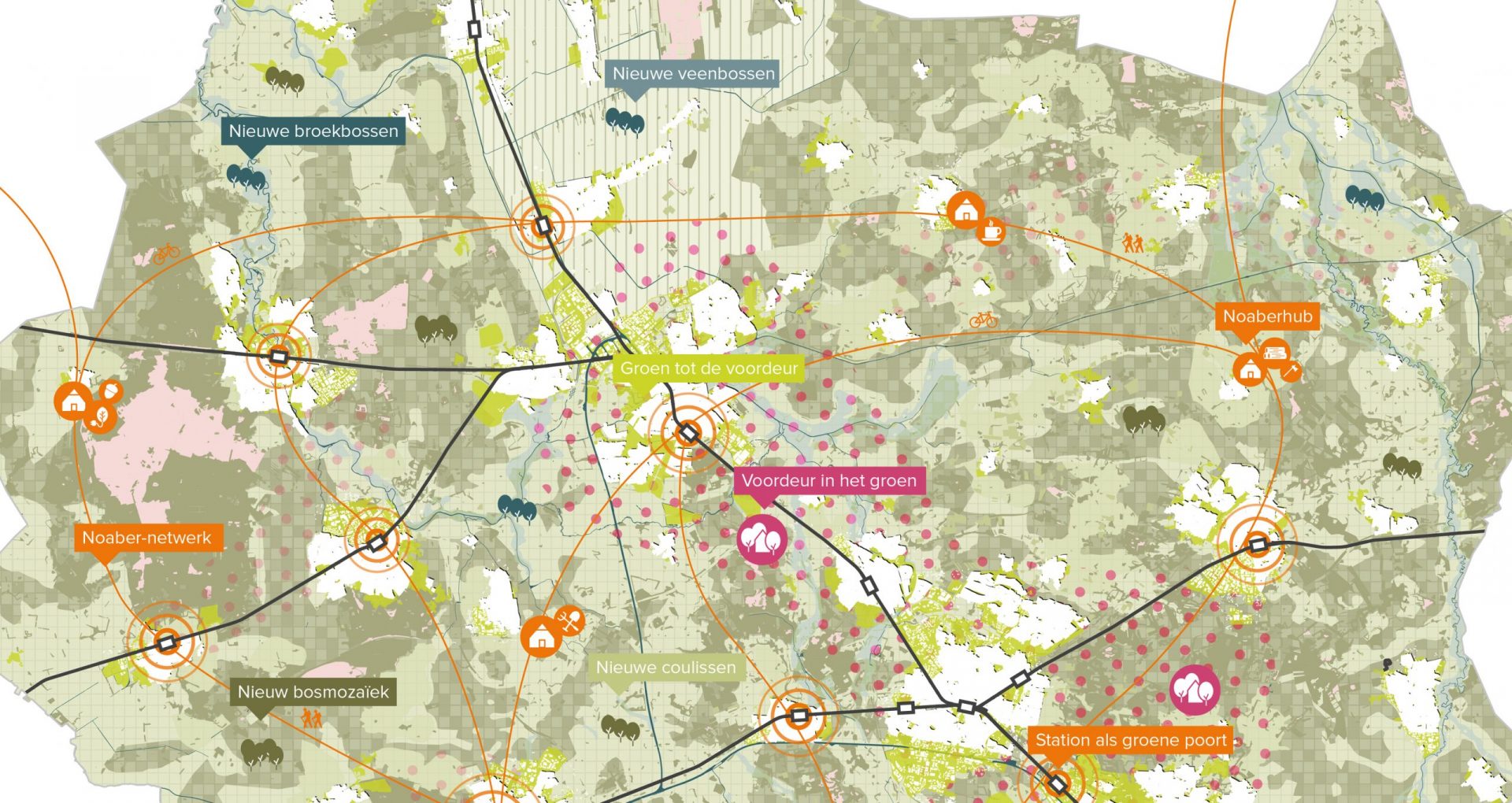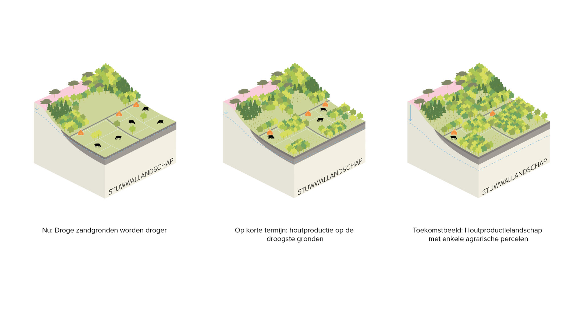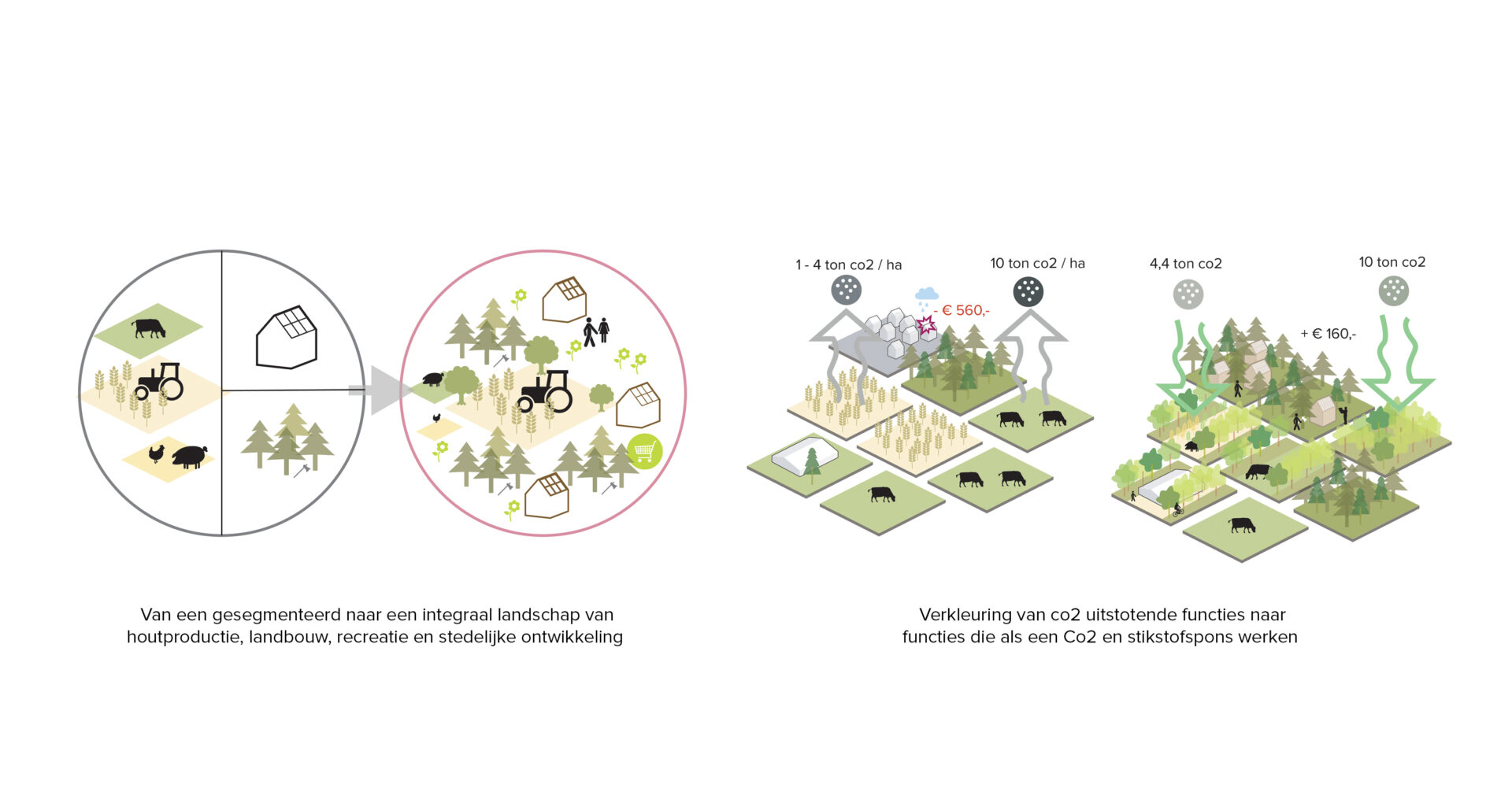 • Nieuwe verdienmodellen: verschillende schakeringen van houtproductie en voedselproductie zorgen voor een nieuw economisch perspectief voor elke boer, variërend van houtproductie als bijverdienste tot de transformatie tot houtboerderijen, of als toekomstig bouwmaterialendepot / houtbank voor ontwikkelende partijen.